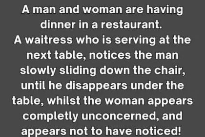 Their waitress, taking another order at a table a few paces away noticed that the man was slowly sliding down…