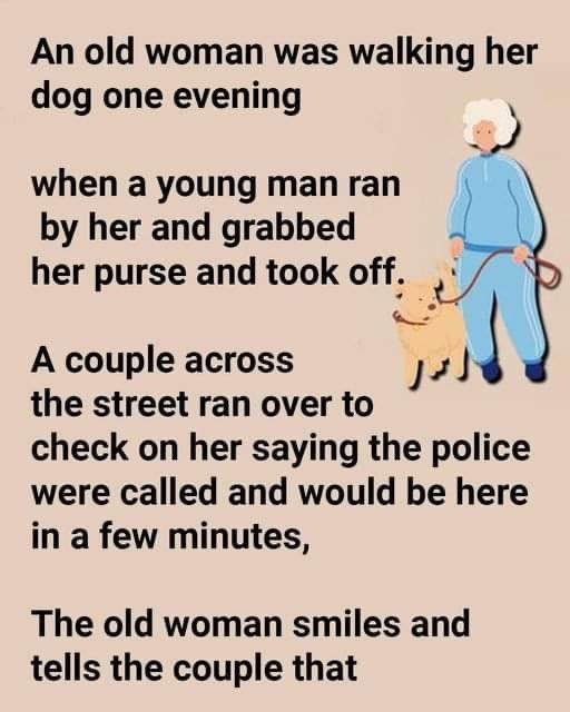 One evening, an old woman was walking her dog when a young man ran by her, grabbed her purse, and took off. A couple across…