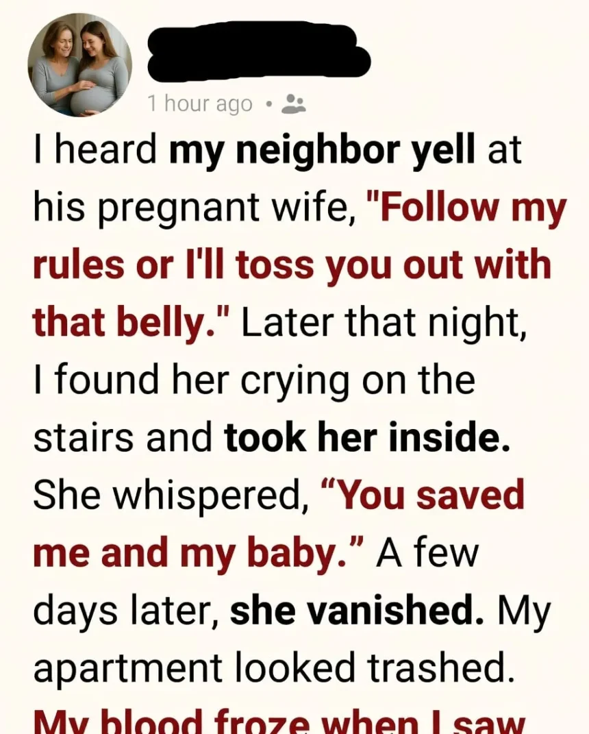 The first time I heard my neighbor yelling at his pregnant wife, it cut straight through the thin walls of our apartments—cold, sharp, and threatening.…