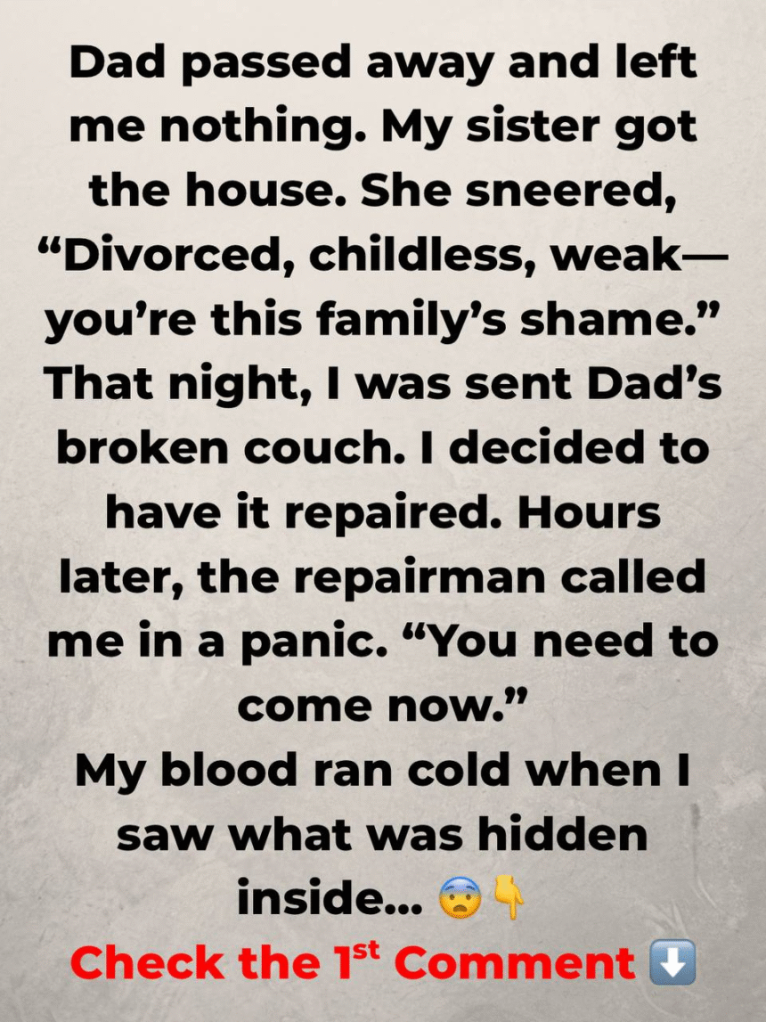 I saw it and couldn’t believe my eyes.Inside the couch frame, there was a hidden compartment. The repairman had torn the fabric to access a broken spring—and found a metal box welded underneath.
