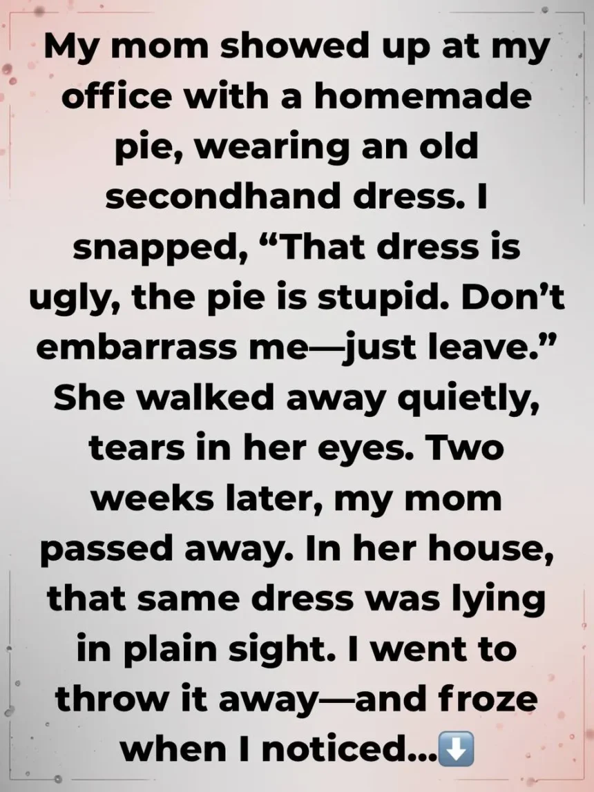 - My mom came to my office with a homemade pie, wearing a secondhand dress. I snapped, “Hide your rags and smelly food, don’t shame me.” She left crying.