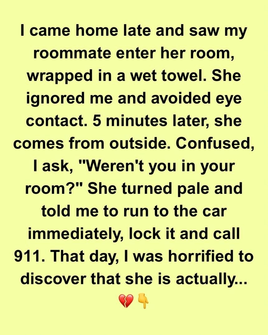 - One day, I came home late and saw my roommate quickly entering her room, wrapped in a wet towel. I said hi, but she ignored me and avoided eye contact.