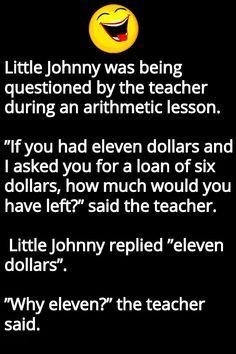 Little Johnny was being questioned by the teacher during an arithmetic lesson. ”If you had eleven dollars and I asked you for a loan of six dollars, how much would you have left?” said the teacher. Little Johnny replied ”eleven dollars”.