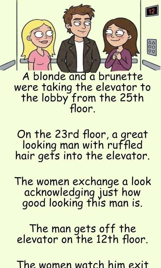 A blonde and a brunette were taking the elevator to the lobby from the 25th floor. On the 23rd floor, a great looking man with ruffled hair gets into the elevator. The women exchange a look acknowledging just how good looking this man is.