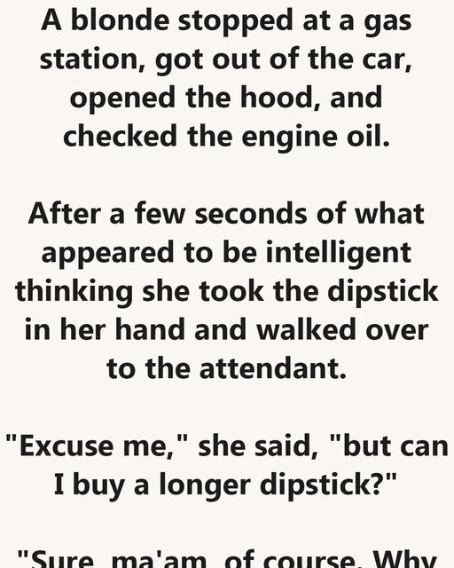 After a few seconds of what appeared to be intelligent thinking she took the dipstick in her hand and walked over to the attendant. “Excuse me,” she said, “but can I buy a longer dipstick?”