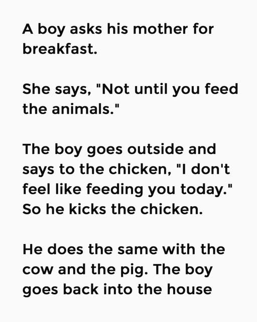 The boy goes outside and says to the chicken, “I don’t feel like feeding you today.” So he kicks the chicken. He does the same with the cow and the pig.