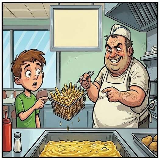 A boy reads a restaurant sign that advertised fat-free free French fries. “Sounds great!” said the health-conscious boy, as he ordered some. He watched as the cook pulled a basket of fries from the fryer.