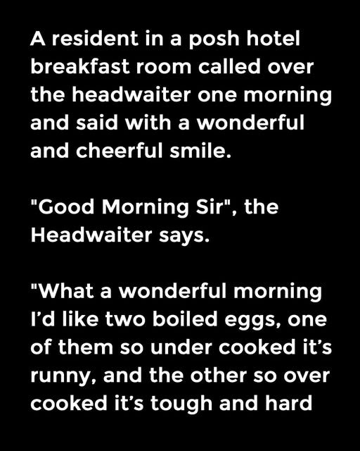 A resident in a posh hotel breakfast room called over the headwaiter one morning and said with a wonderful and cheerful smile. “Good Morning Sir”, the Headwaiter says. “What a wonderful morning I’d like two boiled eggs, one of them so under cooked it’s runny, and the other so over cooked it’s tough and hard to eat.