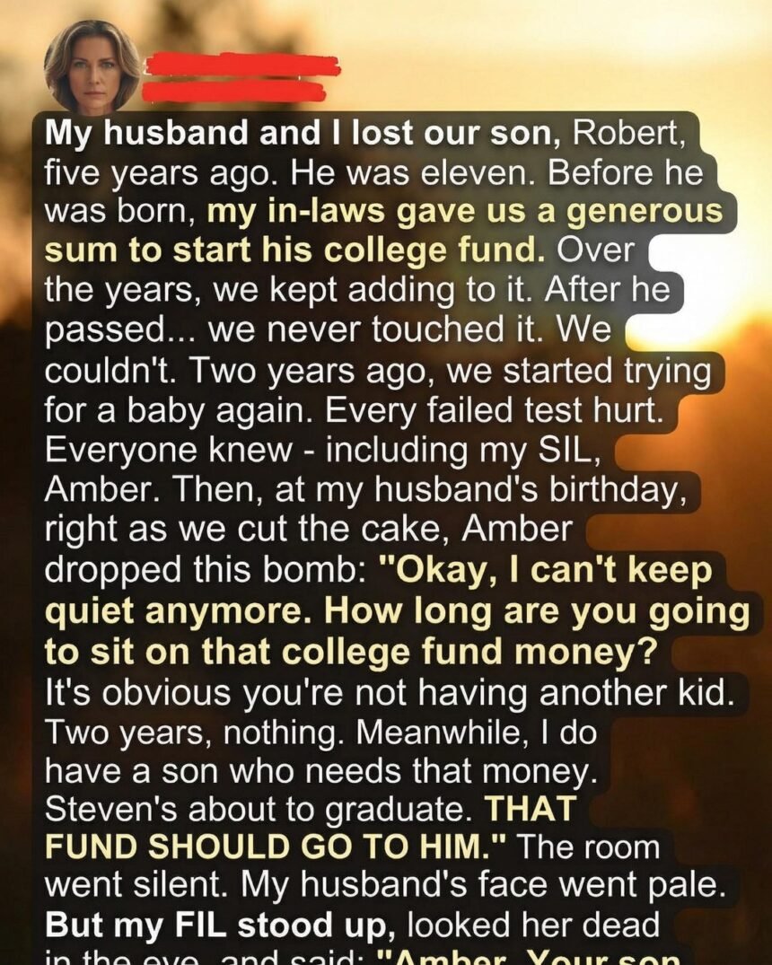 He told Amber that the fund was a gift meant for Robert, and what remained of it belonged to us—not because of the money, but because it represented a part of our son’s life we still cherished. He reminded her that grief cannot be measured or repurposed, and that no family member had the right to decide how we should carry it. The room grew quiet as his words settled, and Amber’s certainty slowly faded into discomfort.