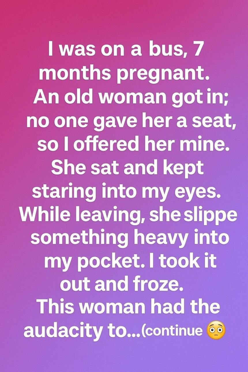 I was riding the bus, seven months pregnant, feeling a mix of excitement and exhaustion. When an older woman climbed aboard, I didn’t hesitate to offer her my seat. She accepted with a grateful smile and kept glancing at me — not in an odd way, but as though she recognized something familiar.