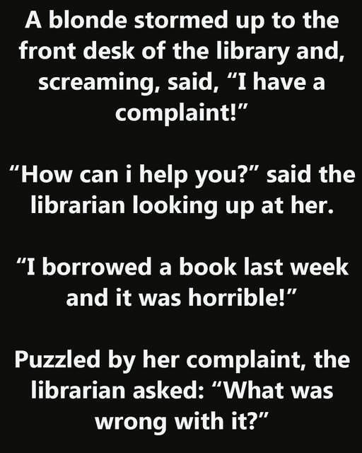 A Horrible Book. A blonde stormed up to the front desk of the library and, screaming, said, “I have a complaint!”