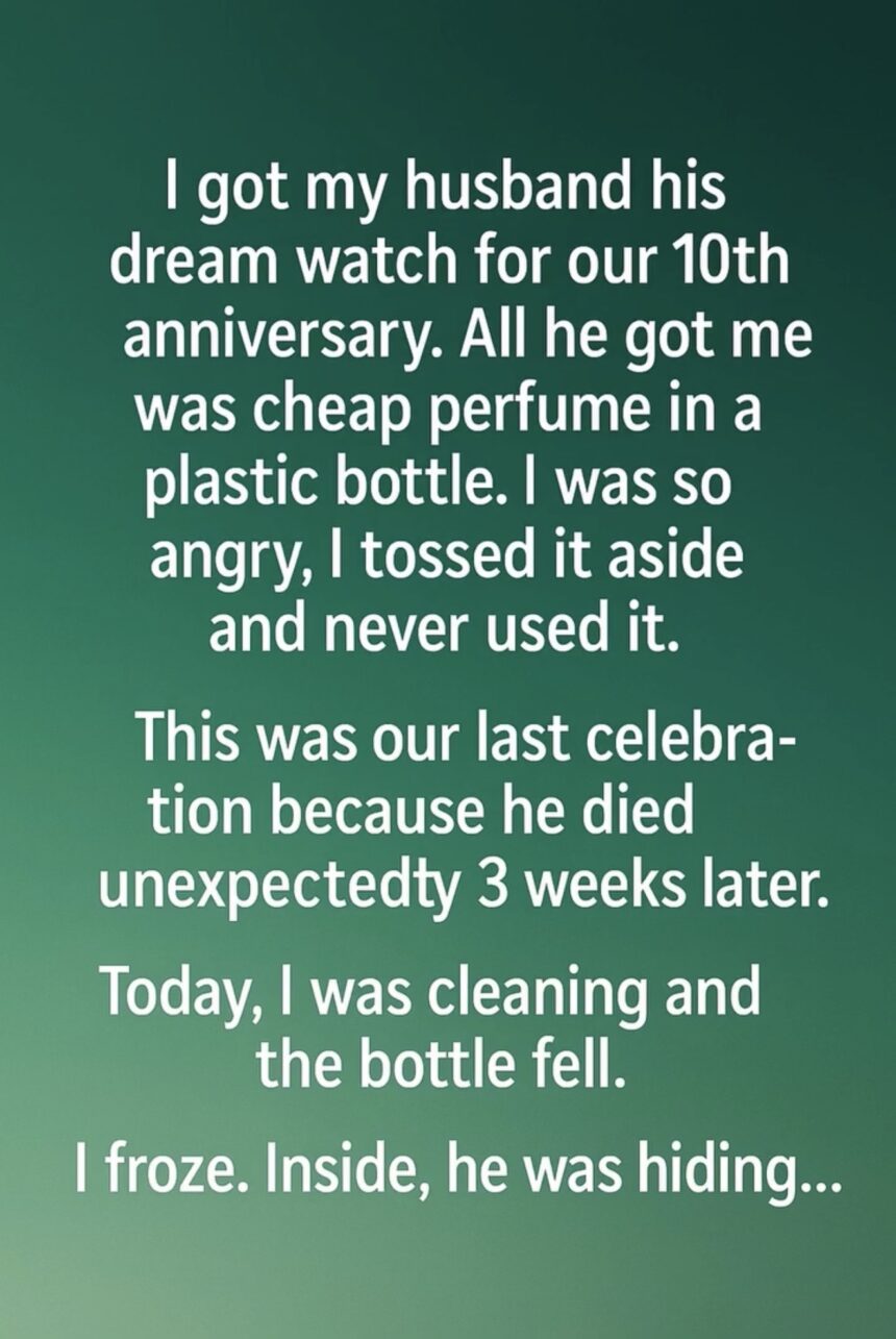 For our 10th anniversary, I surprised my husband with the watch he had always dreamed of. In return, he gave me a small bottle of perfume in simple plastic packaging. I felt quietly disappointed and placed it aside without a second thought.