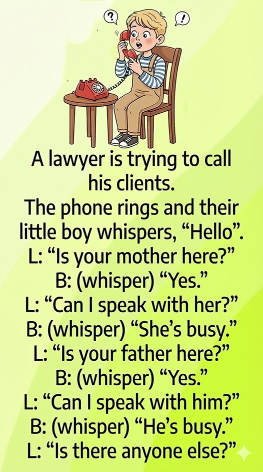 A lawyer is trying to call his clients. The phone rings, and their little boy whispers, “Hello.”