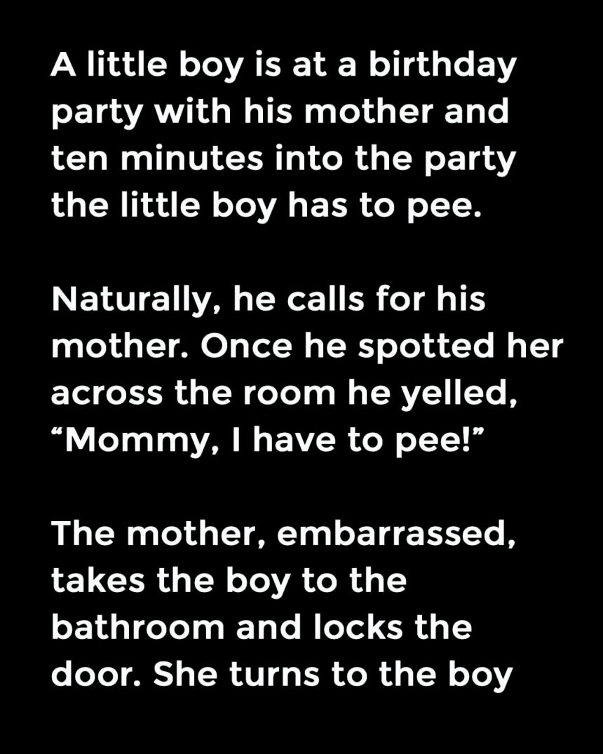 A little boy is at a birthday party with his mother and ten minutes into the party the little boy has to pee. Naturally, he calls for his mother. Once he spotted her across the room he yelled, “Mommy, I have to pee!”