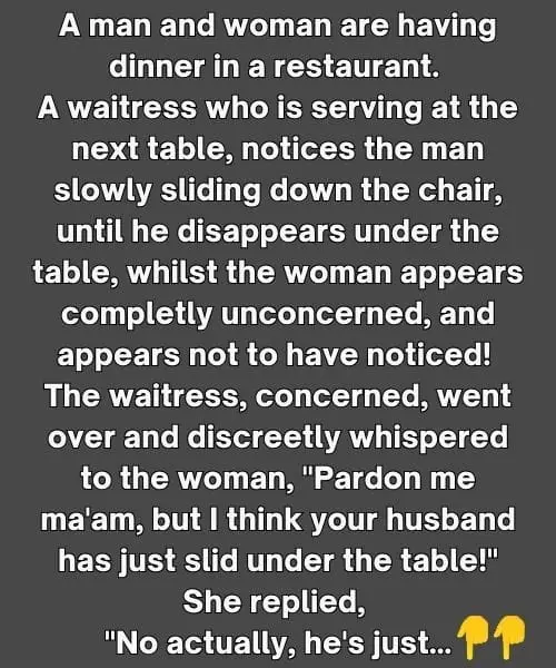 After the waitress finished taking the order, she came over to the table and said to the woman, “Pardon me, ma’am, but I think your husband just slid under the table.”