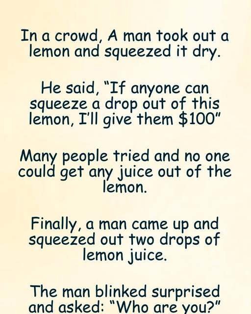 In a crowd, A man took out a lemon and squeezed it dry. He said, “If anyone can squeeze a drop out of this lemon, I’ll give them $100”