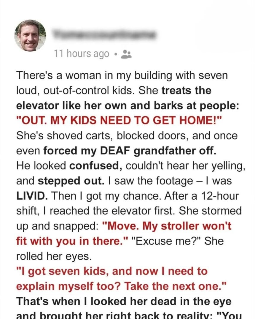 She ruled our apartment building like a queen—loud, entitled, and trailed by seven chaotic kids. Most neighbors stepped aside to avoid her wrath. I did too, until she kicked my deaf grandfather off the elevator.