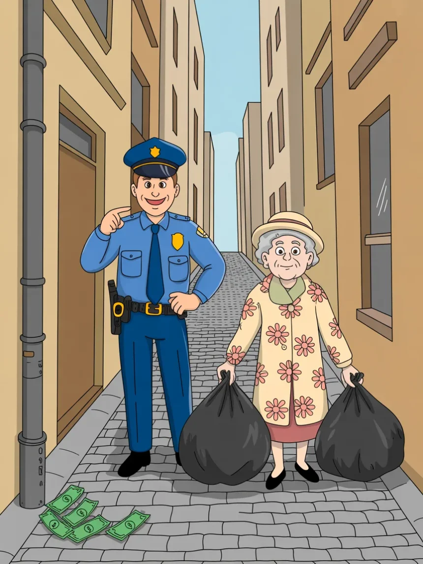 A patrol officer noticed something strange on his route—crisp $50 bills scattered along the sidewalk, leading straight into a narrow alley. Curious, he followed the trail and spotted an elderly woman dragging two trash bags, one of them slowly spilling cash. Ma’am,” he said, “you might want to know one of your bags is leaking.”