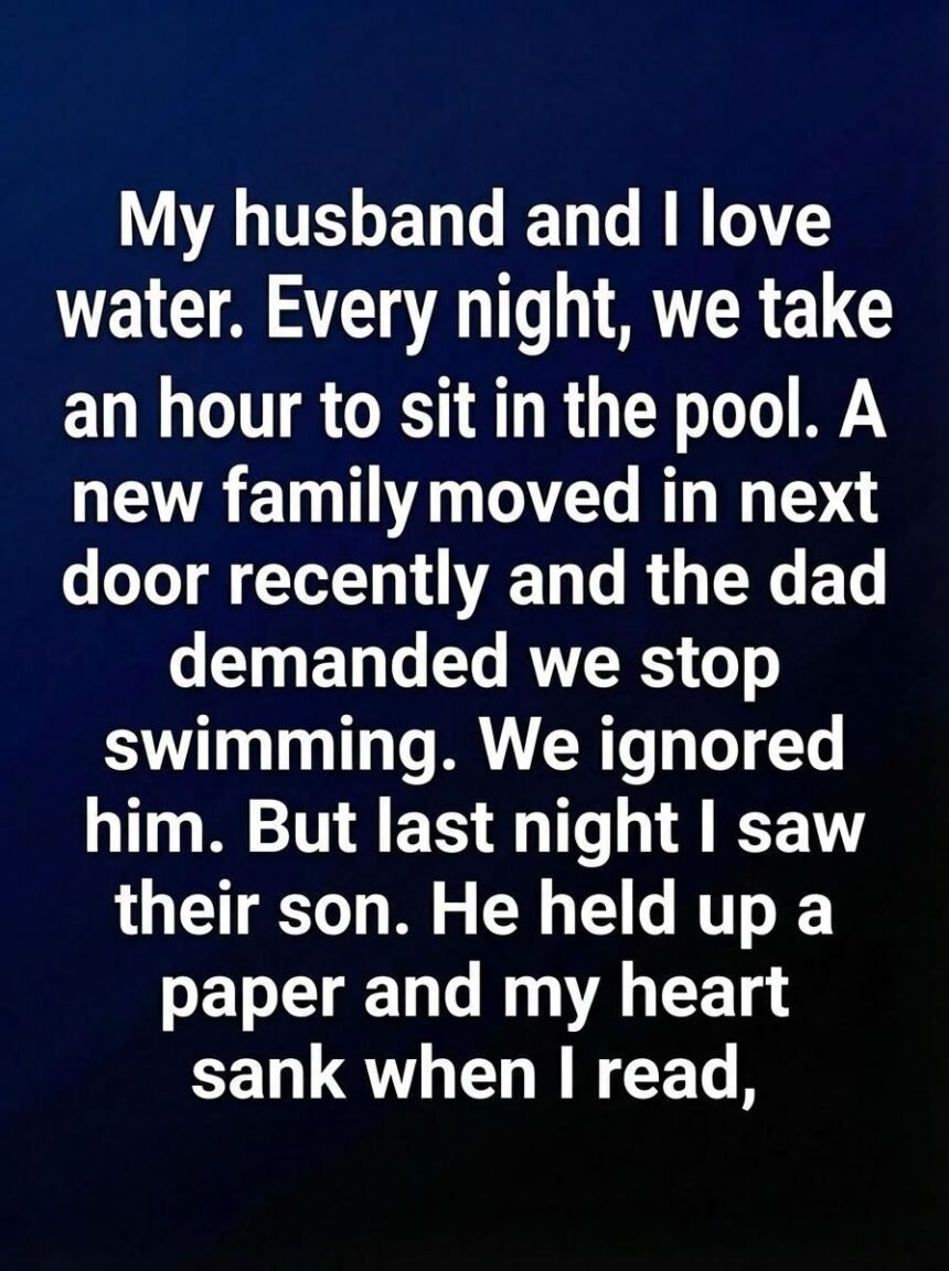 Every night, when the day finally softened, my husband and I slipped into our backyard pool and let the quiet settle around us. We weren’t there to swim laps or impress anyone—it was our time to reconnect, to talk, to breathe. So when the new neighbor asked us to stop using the pool at night, the request felt abrupt and unfair.