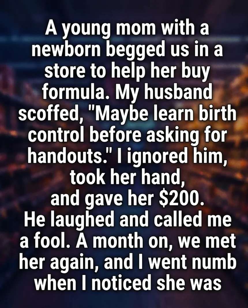 I remember the fluorescent lights in that small store, how they hummed softly above us as if nothing important was happening. She stood near the baby aisle, her arms wrapped protectively around a tiny newborn, her eyes searching faces more than shelves. When she finally approached us, her voice was careful, almost apologetic, as if asking for help was something she had practiced and still feared.