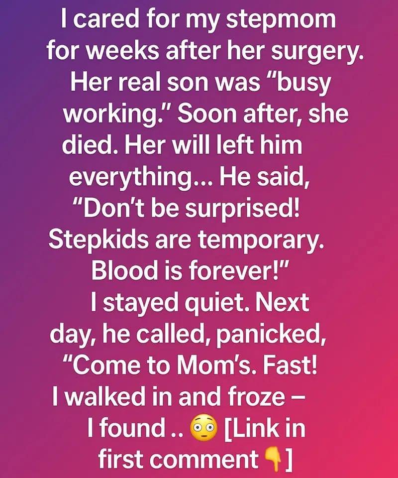 Stepkids come and go—blood is what truly matters.” I said nothing—not because I agreed, but because the grief already felt heavy enough without adding anger to it. Day after day, I had cooked her meals, helped her take slow, painful walks through the living room, and stayed by her side when the pain made her lose hope. I never expected gratitude or reward.
