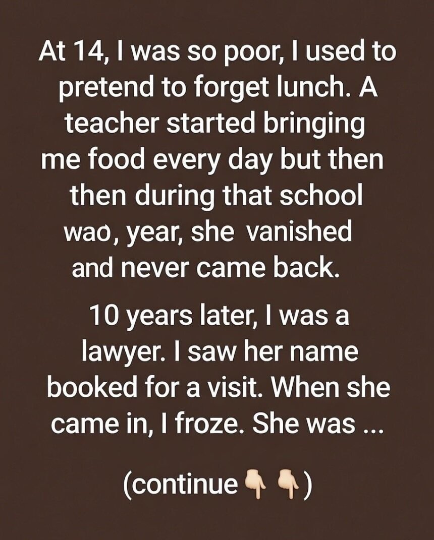 She looked surprised, then delighted when she recognized me.I told her everything: how her kindness had carried me through, how it had inspired me to study hard, get scholarships, and eventually become a lawyer. She listened quietly, tears welling in her eyes.Then she explained why she had left—her family had needed her in another state, and she had to step away from teaching.
