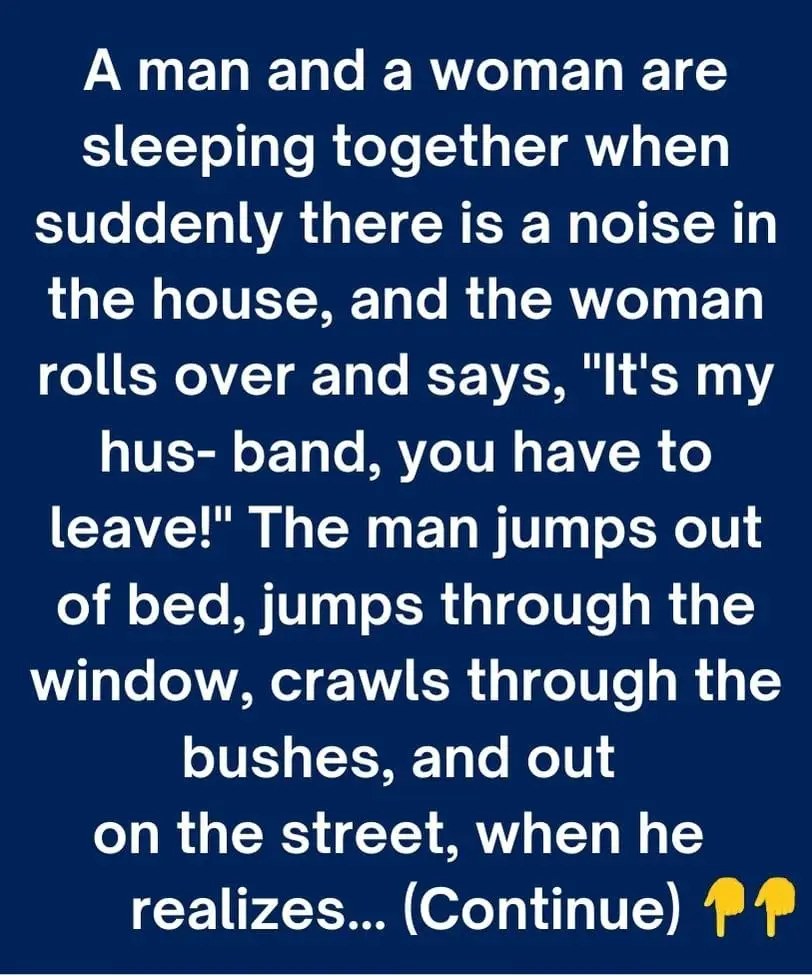 A man and a woman are sleeping together when suddenly there is a noise in the house, and the woman rolls over and says, ”It’s my husband, you have to leave!