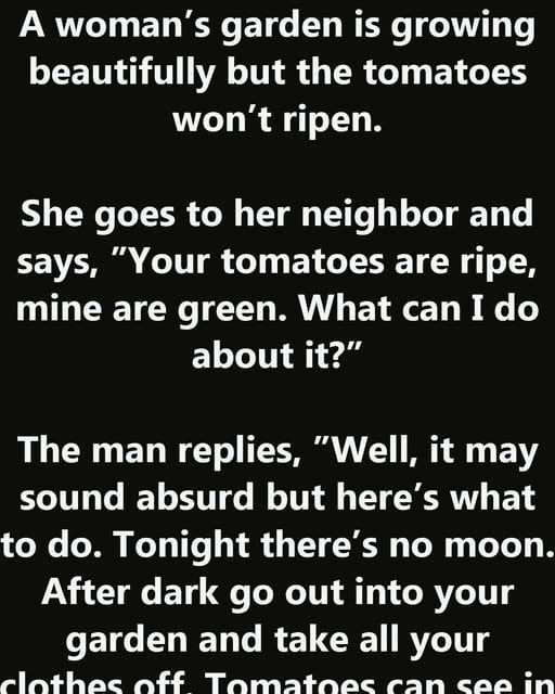 A woman’s garden is growing beautifully but the tomatoes won’t ripen. She goes to her neighbor and says, ”Your tomatoes are ripe, mine are green. What can I do about it?”