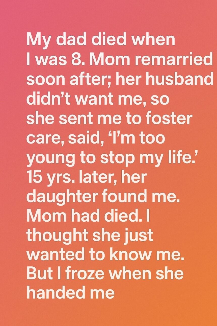 A young woman with a gentle, familiar smile introduced herself as my half-sister, saying she had been searching for me. She told me Mom had passed away, and a quiet ache settled in my chest that I wasn’t prepared for. In her hands was a small, carefully wrapped box.