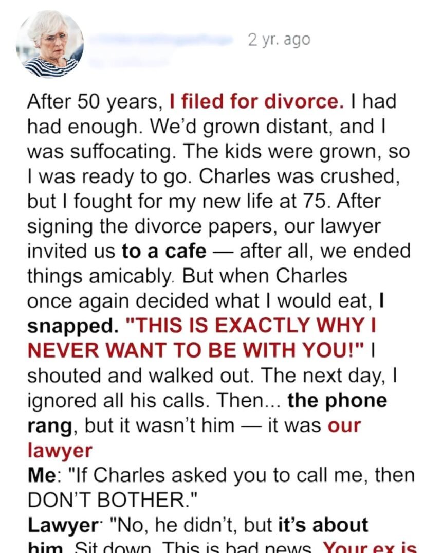 Our quarrels grew more frequent after that. Eventually, I asked for a divorce—and to my surprise, Charles didn’t try to stop me. Perhaps he knew that at our age, the emotional strain wasn’t good for either of us.