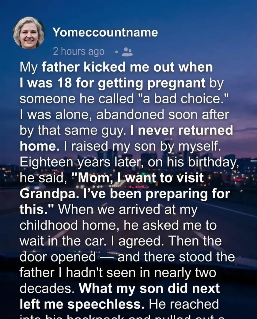 Calm and thoughtful, he told me he wanted to meet his grandfather. I felt a mix of emotions—uncertainty, hesitation, and something I hadn’t expected: hope. When we arrived at my childhood home, he asked me to wait in the car.