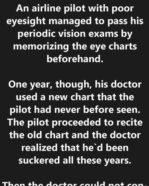 An airline pilot with poor eyesight managed to pass his periodic vision exams by memorizing the eye charts beforehand. One year, though, his doctor used a new chart that the pilot had never before seen. The pilot proceeded to recite the old chart and the doctor realized that he`d been suckered all these years.