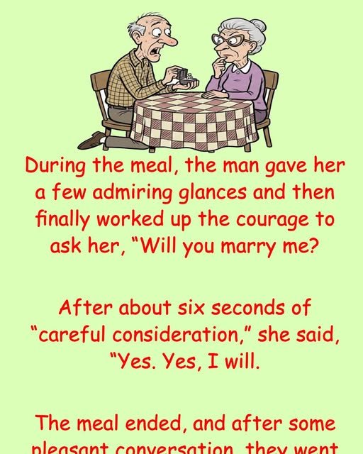 During the meal, the man gave her a few admiring glances and then finally worked up the courage to ask her, “Will you marry me? After about six seconds of “careful consideration,” she said, “Yes. Yes, I will.