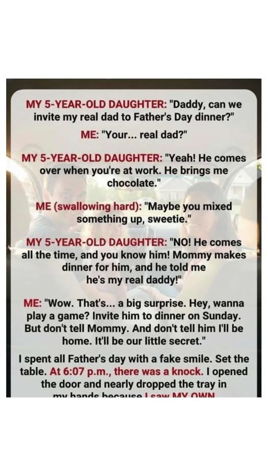 What began as an ordinary drive home from daycare turned into a moment that quietly unraveled everything I thought I knew about my family. My five-year-old daughter, with the blunt honesty only children possess, asked if we could invite her “real dad” to Father’s Day dinner—the man who visited when I was at work and brought gold-wrapped chocolates. Her calm certainty made it clear this wasn’t imagination but a truth carefully hidden from me.