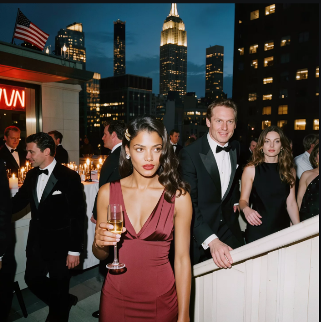 Ivy sets her champagne down. The rooftop party swirls around them—crystal and candlelight, a string quartet playing something that was probably romantic an hour ago.