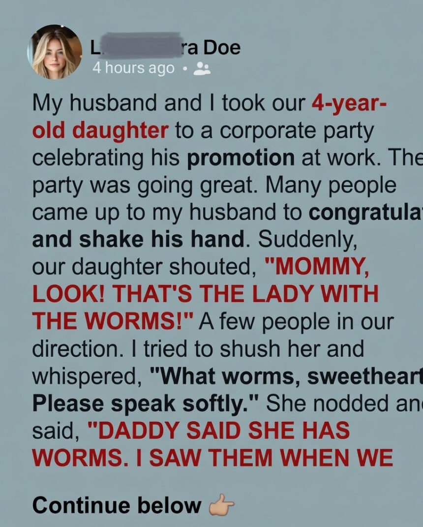 “Mommy, look! That’s the lady with the worms,” she said, loud enough for others to hear. Confused, I gently questioned her, and she explained that she had seen “red worms” on that woman’s bed—Tina, a coworker I’d noticed around Mark before.