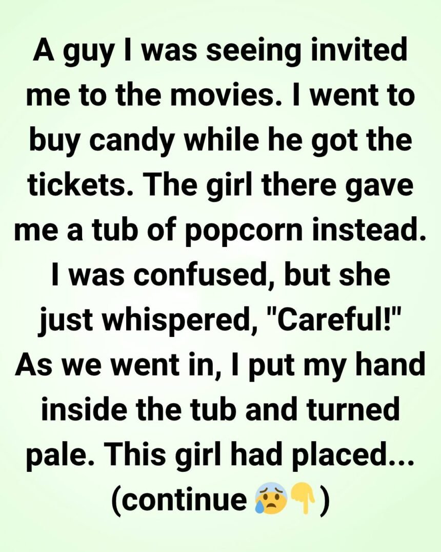 Her voice was barely audible over the chatter and hum of the popcorn machines, but the seriousness in her eyes made my stomach twist. Before I could ask what she meant, another customer stepped up, and the moment was gone. She slid the popcorn toward me and turned away.