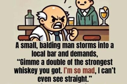 A small, balding man storms into a local bar.
