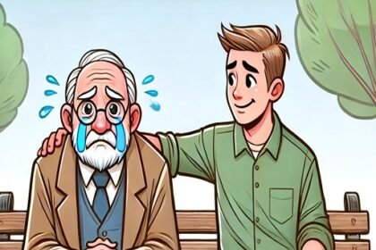 A 90-year-old man is sitting on a park bench, sobbing