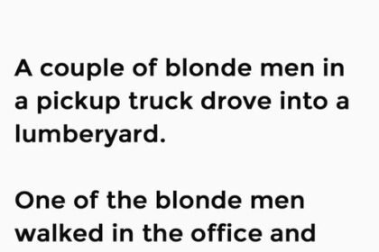 A couple of blonde men in a pickup truck drove into a lumberyard.