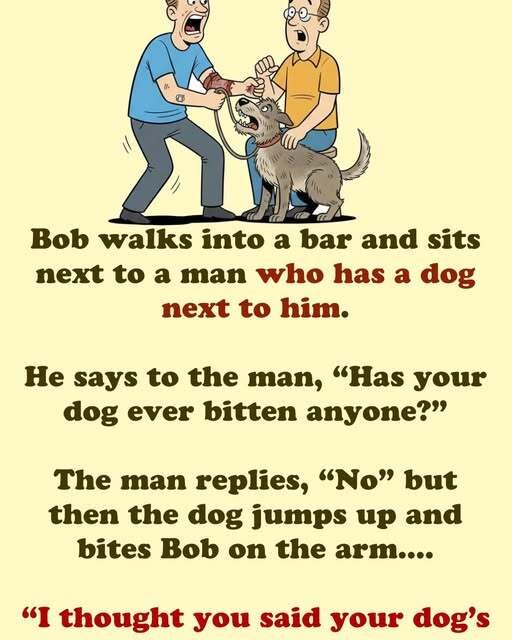 The man replies, “No” but then the dog jumps up and bites Bob on the arm. “I thought you said your dog’s never bitten anyone!” shouts Bob.
