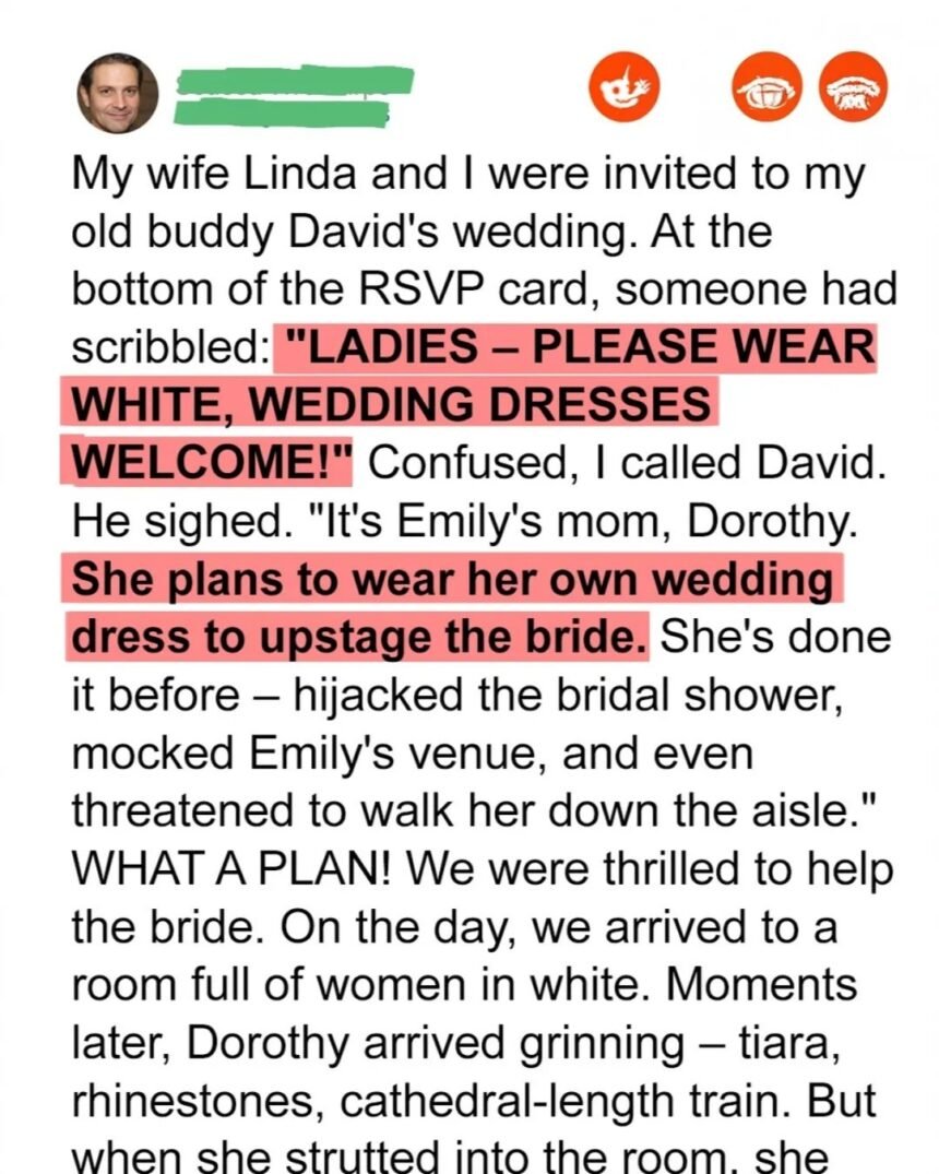 The Invitation That Sparked Suspicion – When David and Emily’s wedding invitation arrived, my wife Linda was the first to notice something odd. At the bottom of the RSVP card, written in elegant, dramatic handwriting, was a strange request: “Ladies — please wear white, wedding dresses welcome!” Everyone knows that wearing white to someone else’s wedding is a major faux pas, so naturally, we were baffled. When I called David to ask about it, he sighed and revealed the truth — Emily’s mother, Dorothy, had decided she was going to wear her old wedding gown to outshine her own daughter on her big day.