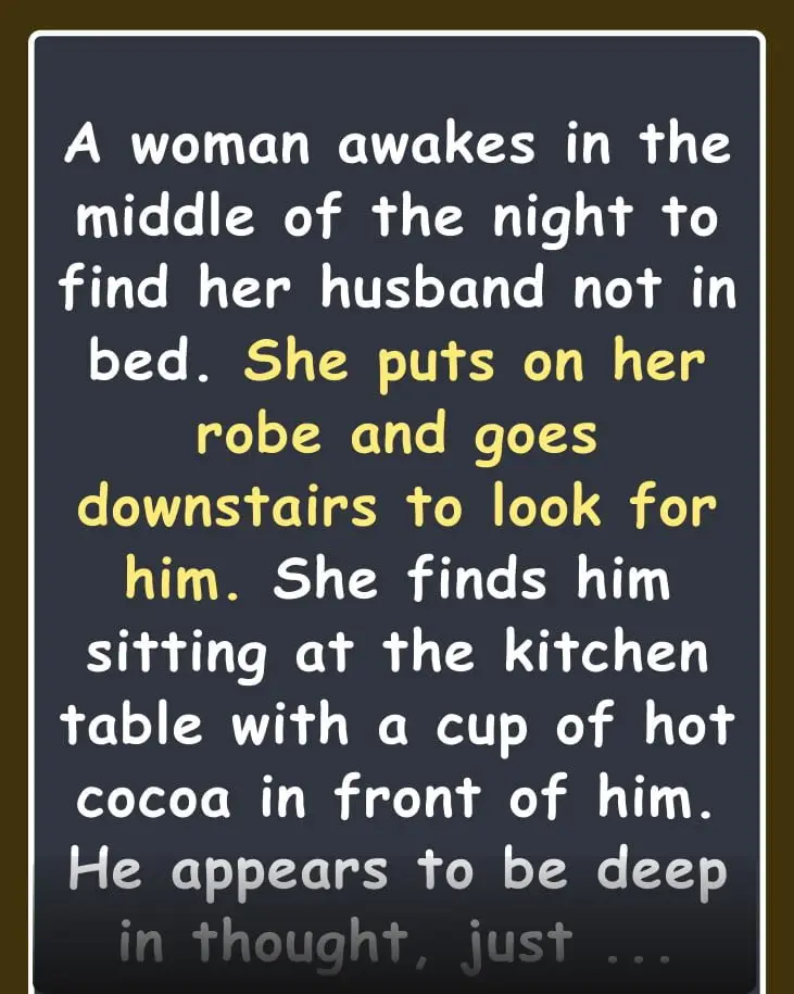She finds him sitting at the kitchen table with a cup of hot cocoa in front of him.