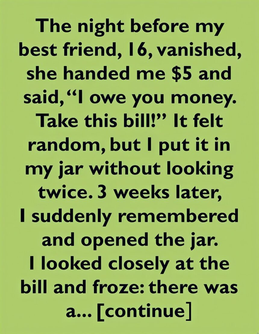 The night before my best friend disappeared, she handed me a $5 bill and said, “I owe you money. Take this bill!” It seemed random — just another one of her quirky gestures — so I smiled, took it, and dropped it into my savings jar without giving it another thought. I had no idea that moment would become the last time I ever saw her.