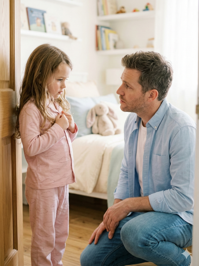“Hey, kiddo,” I said gently, forcing my voice to stay calm while a strange uneasiness stirred in my chest.