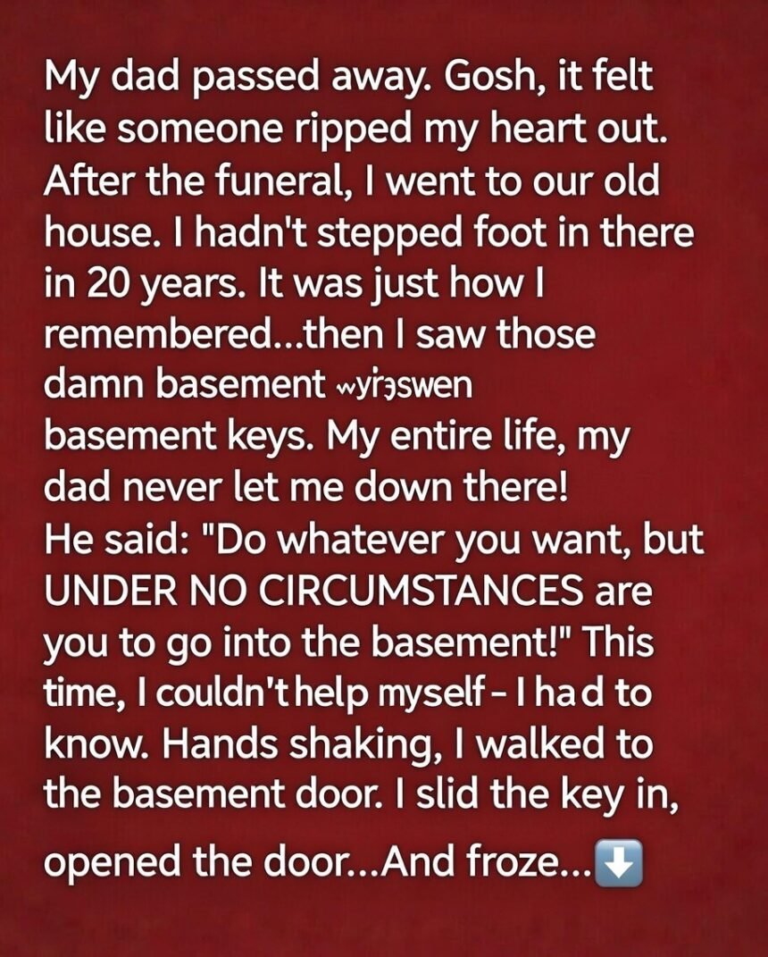 I thought burying my father would be the hardest part—until I discovered a small, rusty key tied with a faded ribbon in his desk. I knew instantly what it must open: the basement door he had forbidden me from entering my entire life. With my hands trembling, I turned the lock.