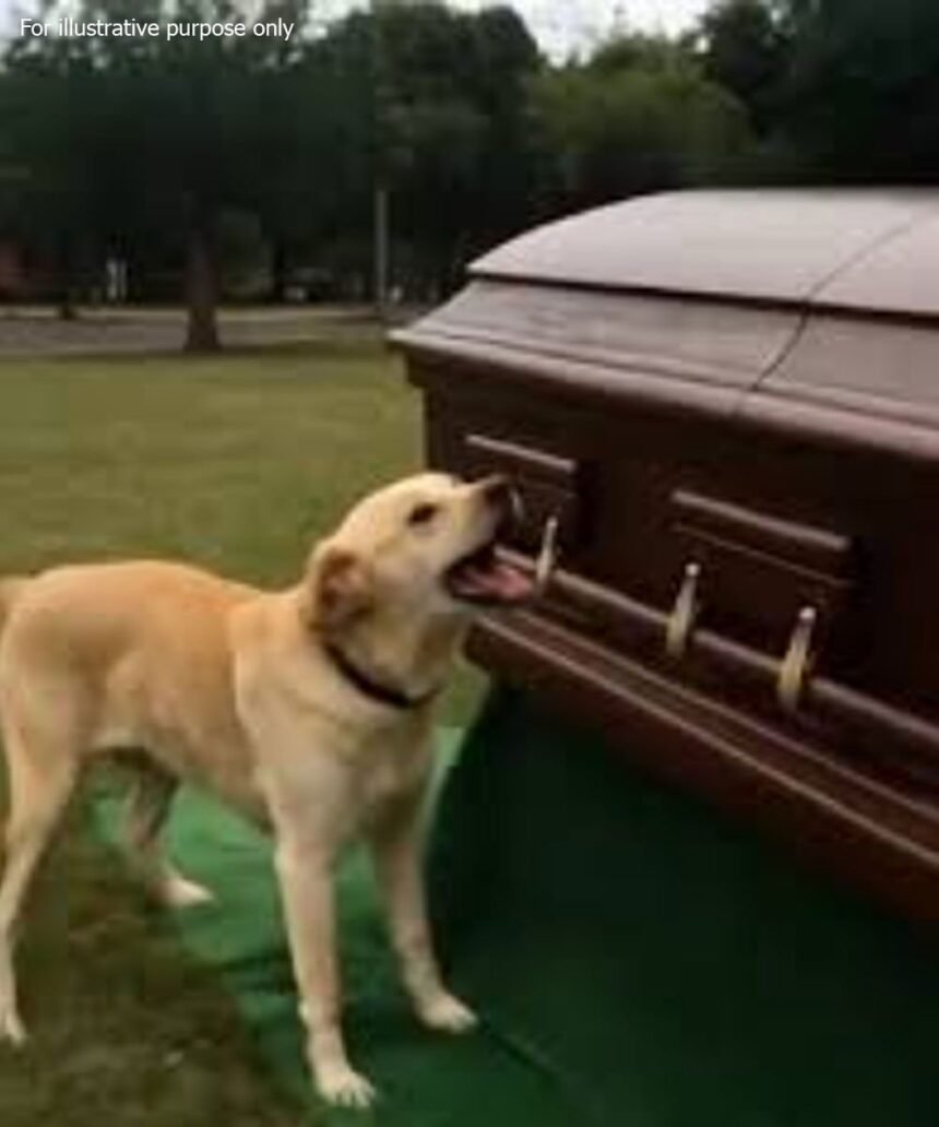 She jumped onto the casket, knocking over the flowers, and barked loudly.