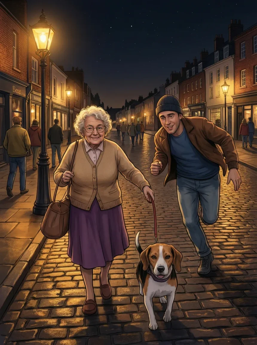 An elderly woman was walking her dog in the evening. A young man approached her, took her purse, and ran away. A couple across the street hurried over to check on her, stating that they had called the cops and they would arrive in a few minutes.