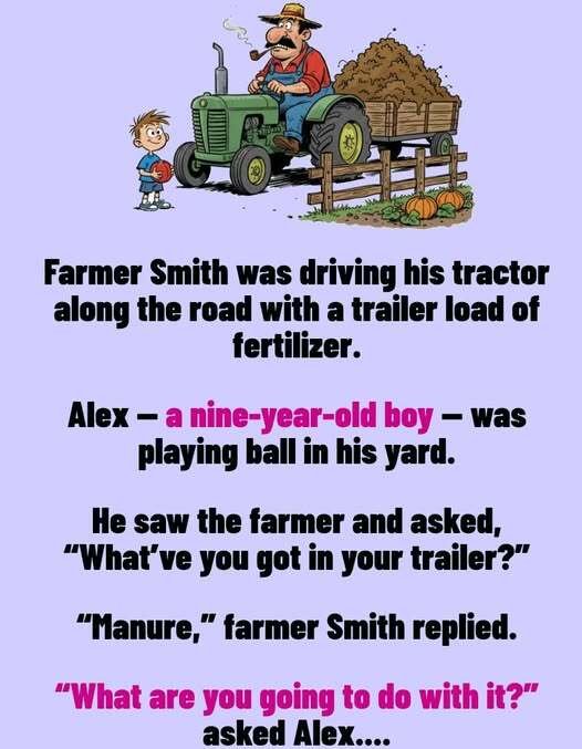 Farmer Smith was driving his tractor along the road with a trailer load of fertilizer. Alex — a nine-year-old boy — was playing ball in his yard. He saw the farmer and asked, “What’ve you got in your trailer?”