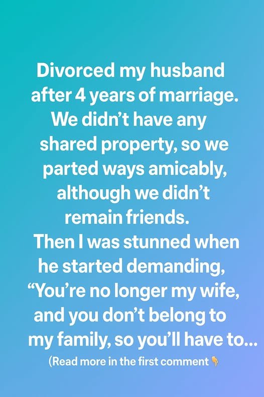 Divorced my husband after 4 years of marriage. We didn’t have any shared property, so we parted ways amicably, although we didn’t remain friends. Then I was stunned when he started demanding, “You’re no longer my wife, and you don’t belong to my family, so you’ll have to…”